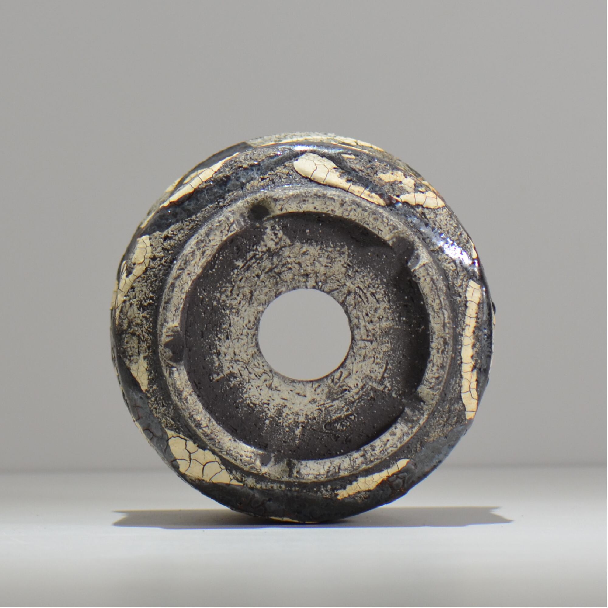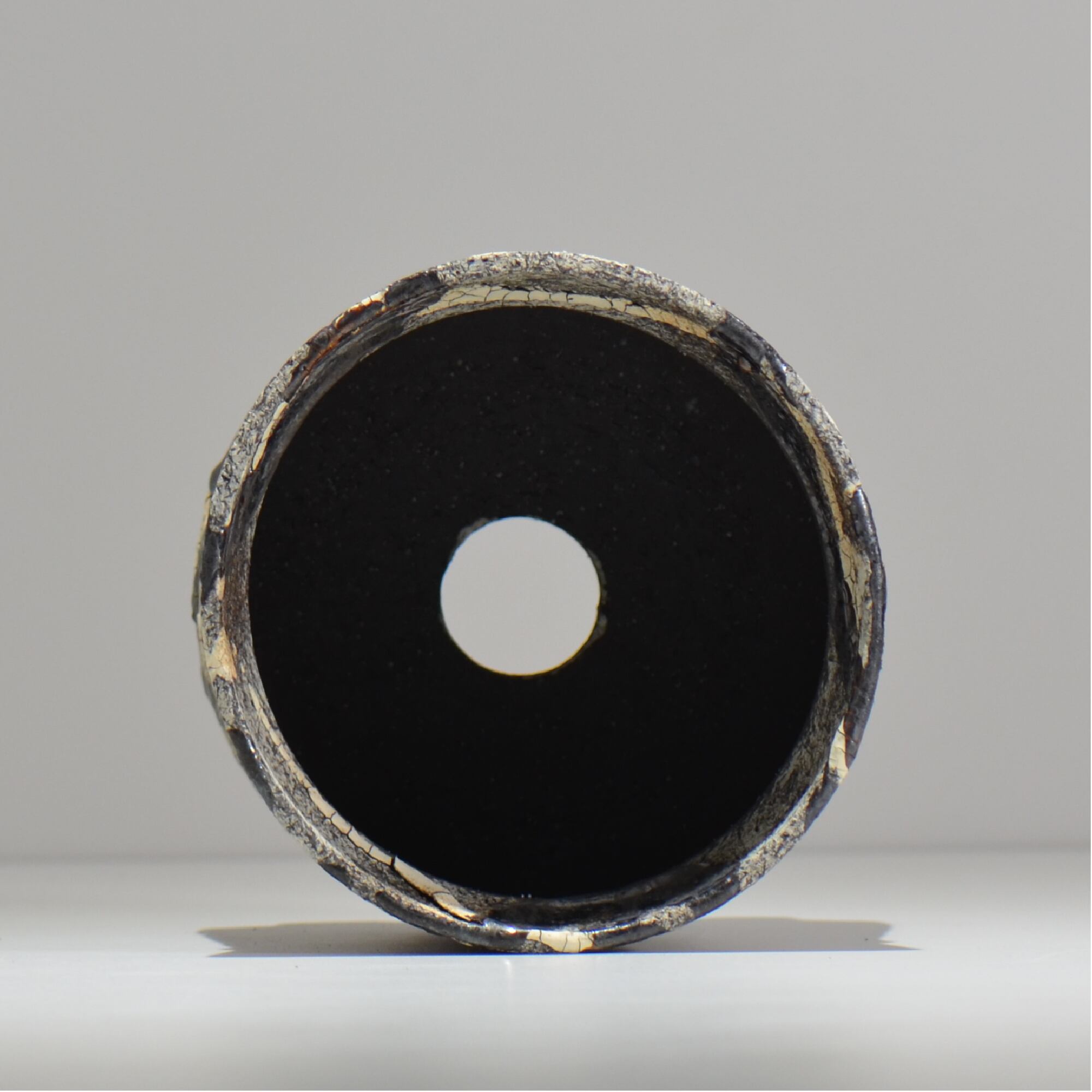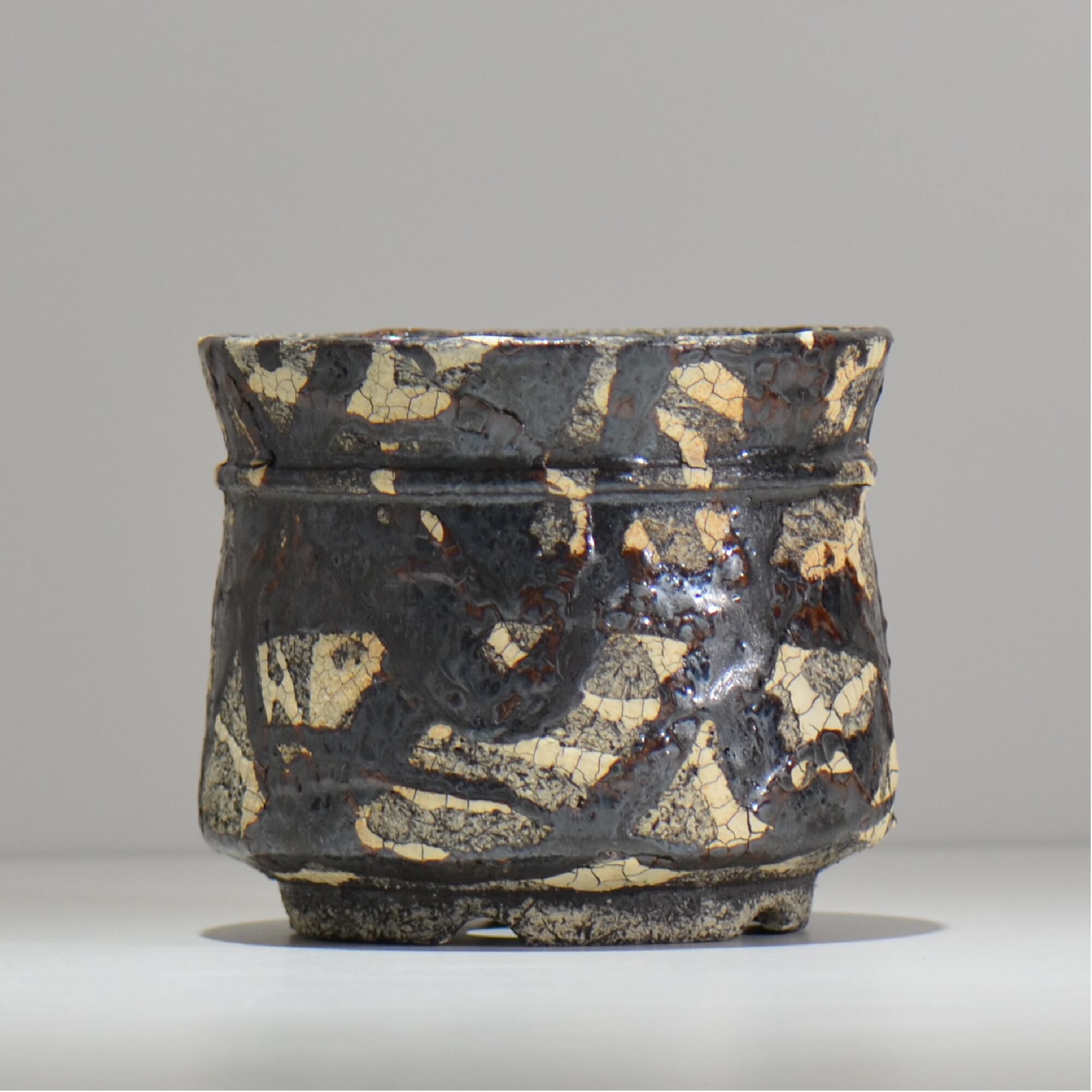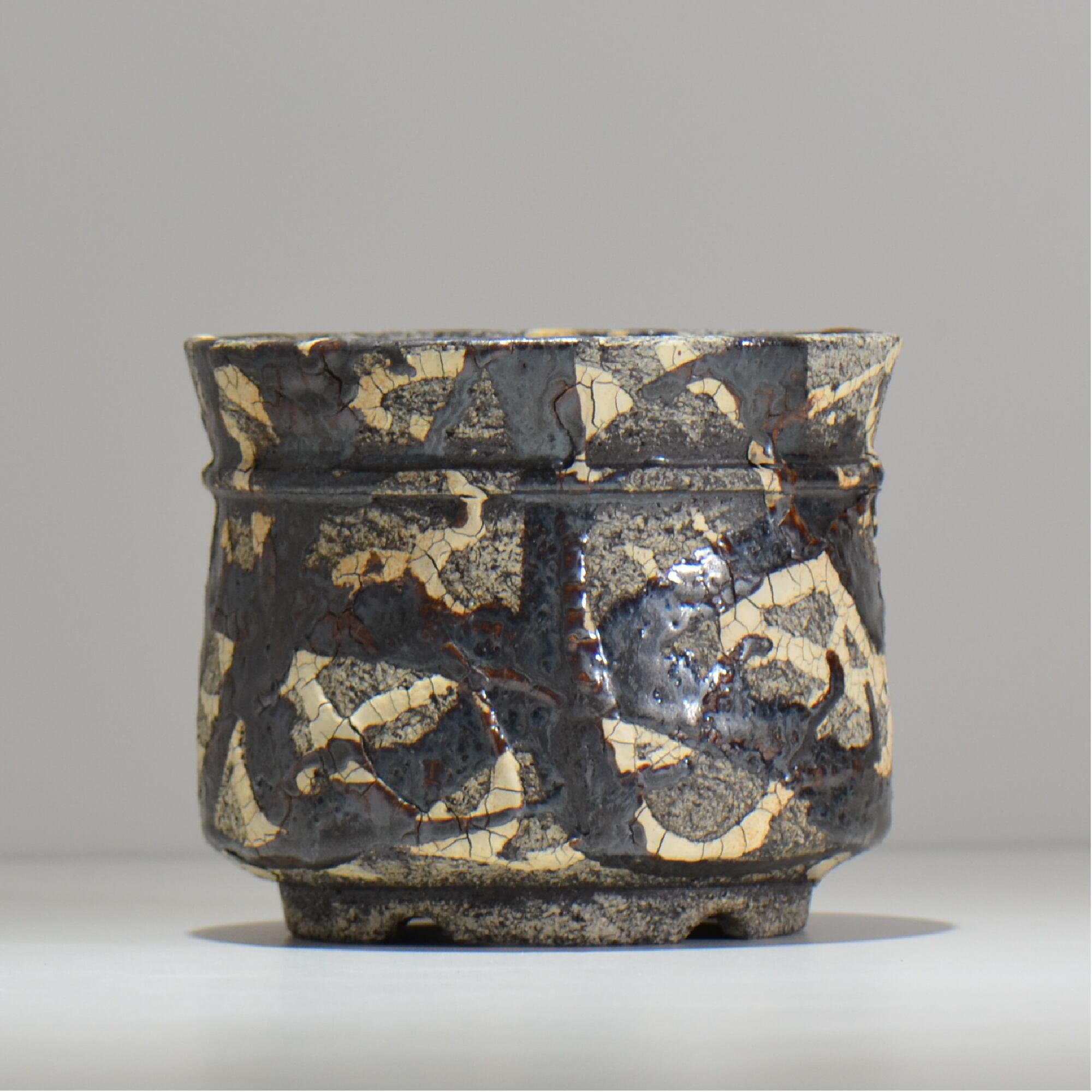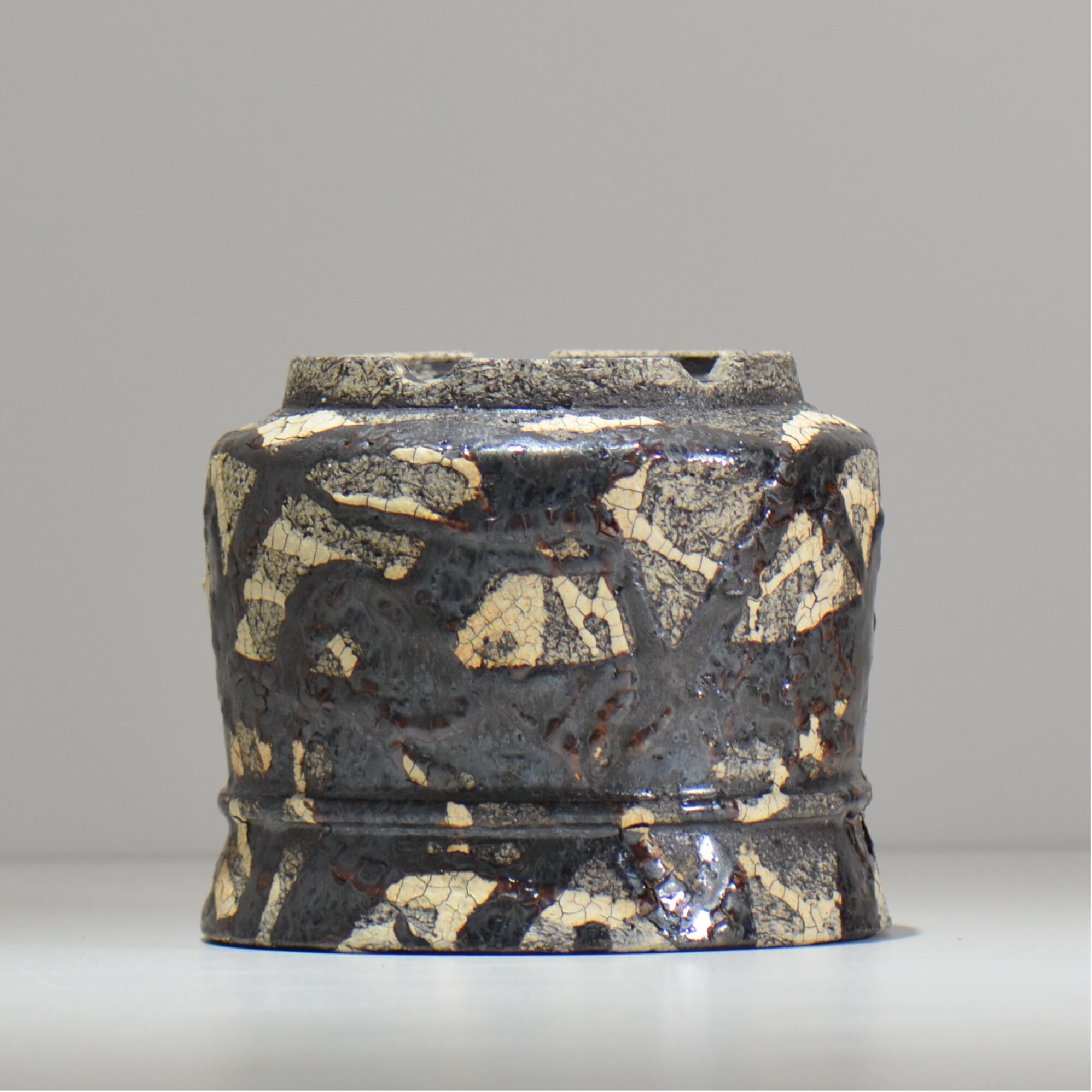 白と黒の釉薬を折り重ねて「蔓-kazura-」を表現しました。