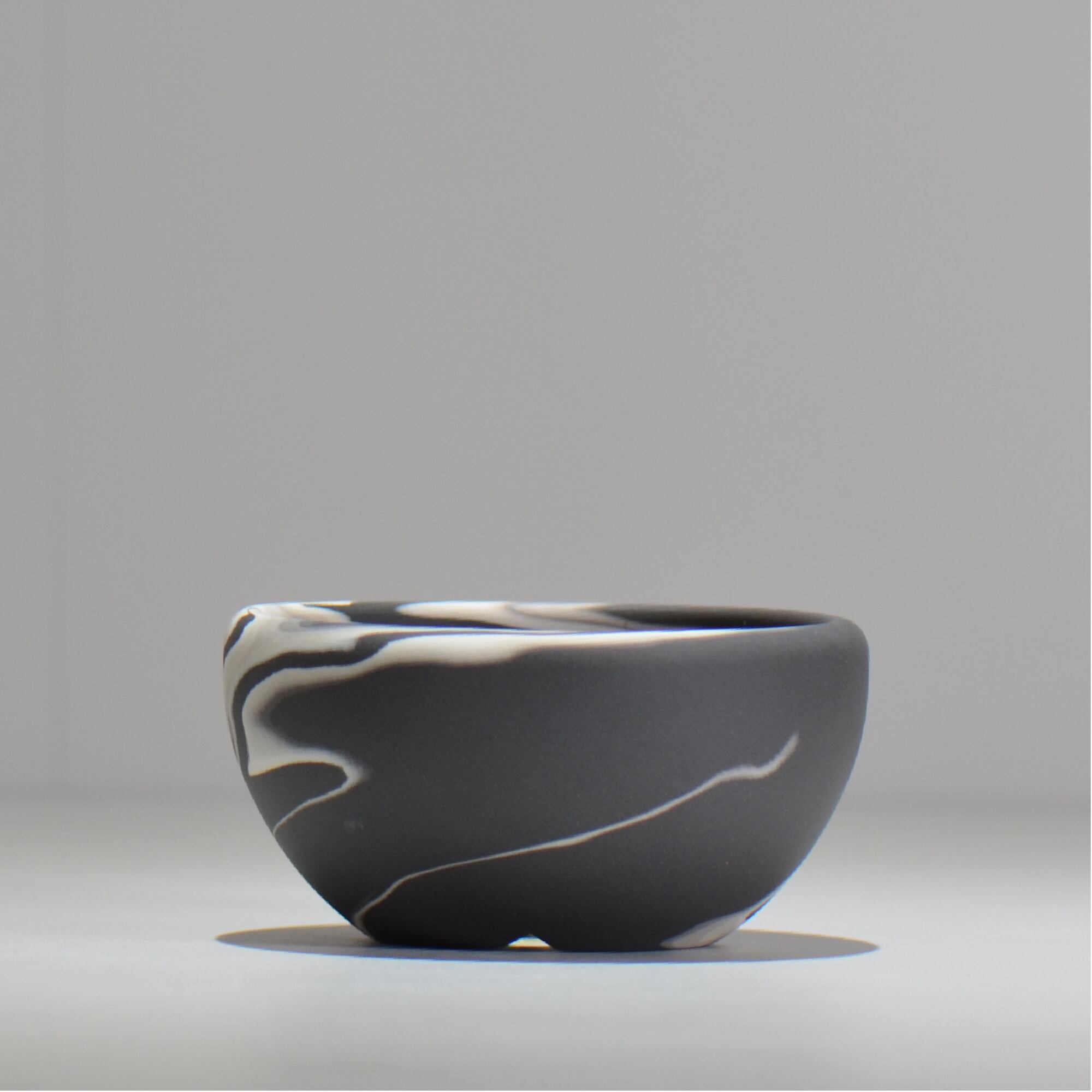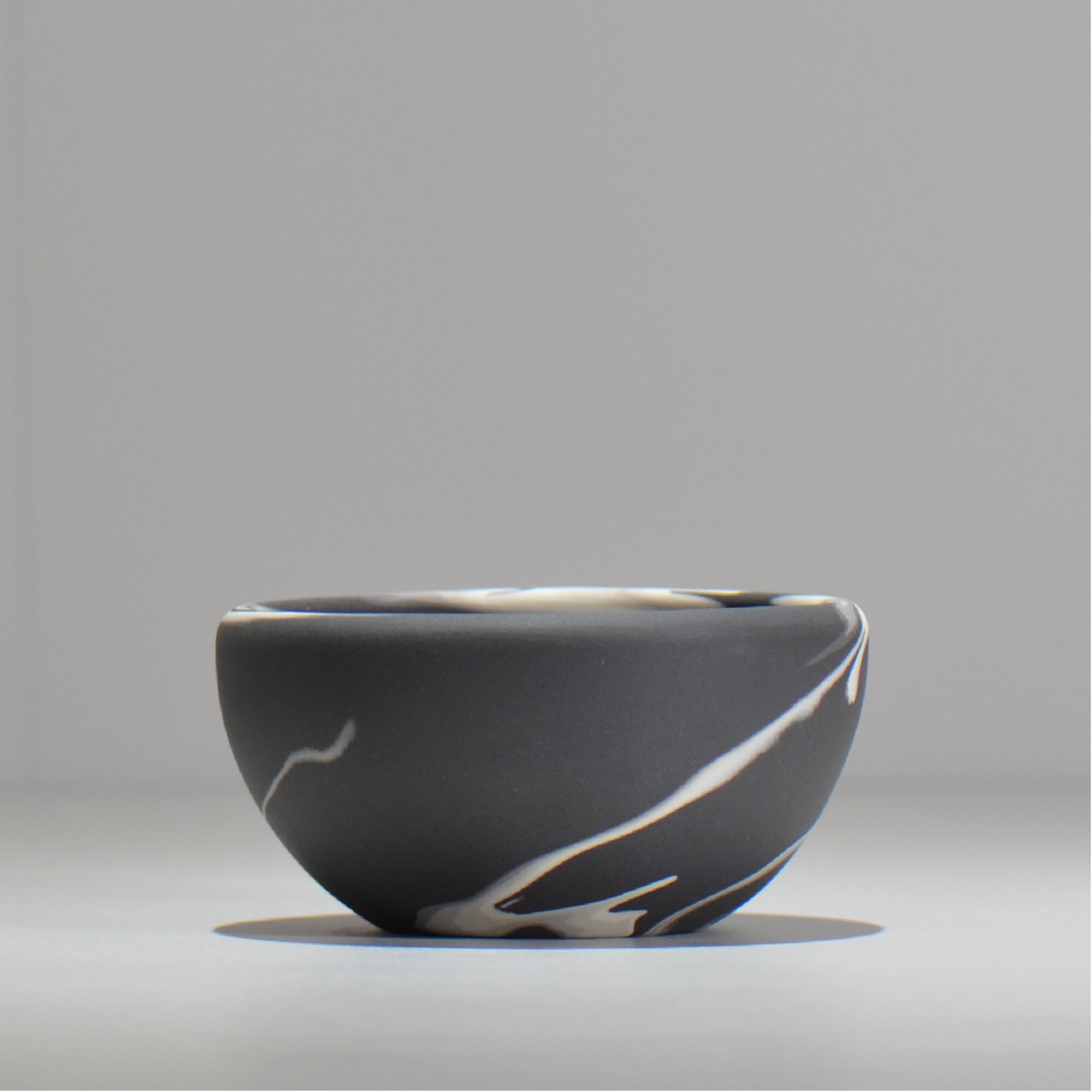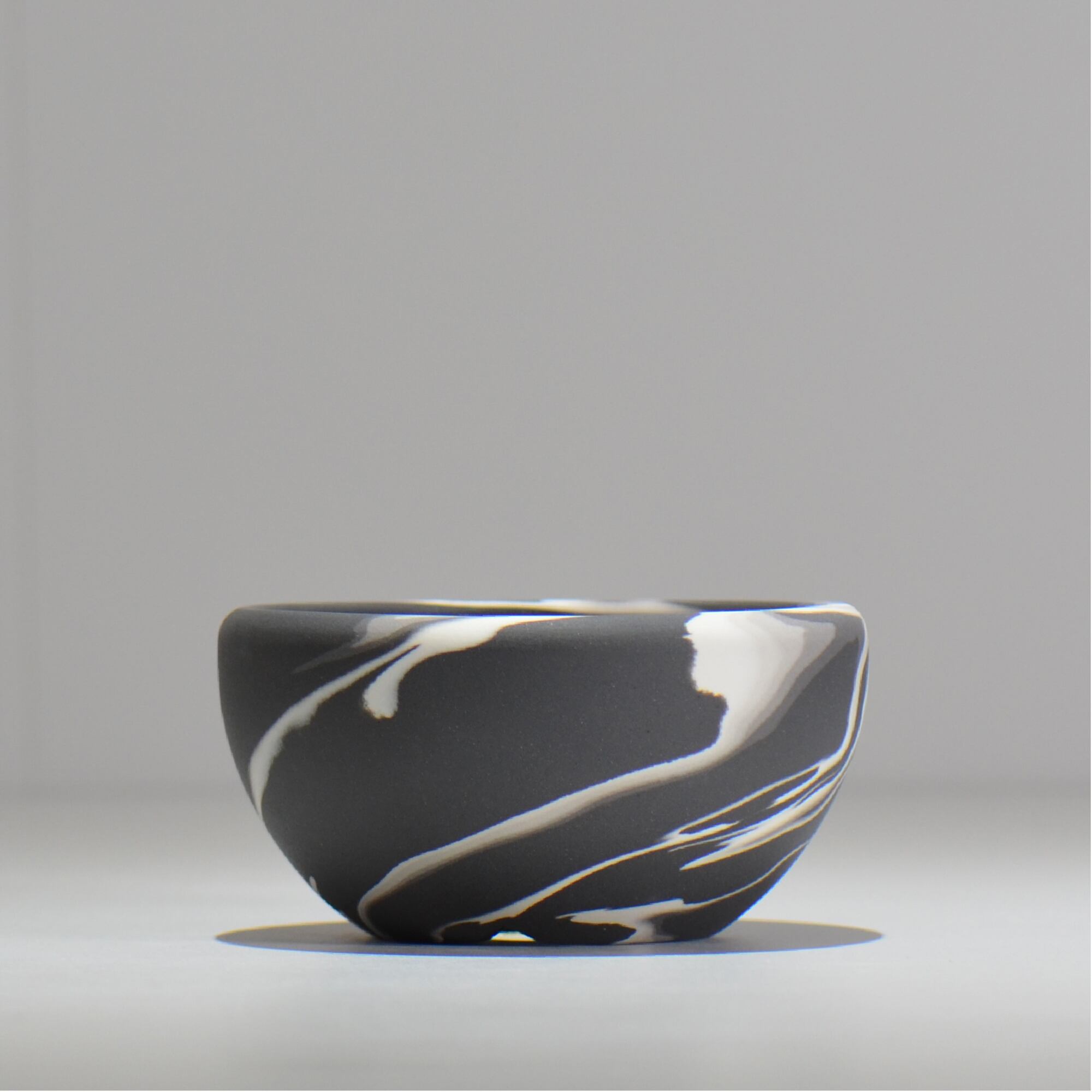 色の異なる磁土を一緒に練り合わせて成形し、全体を削ってゆくと様々な模様が表出してきます。