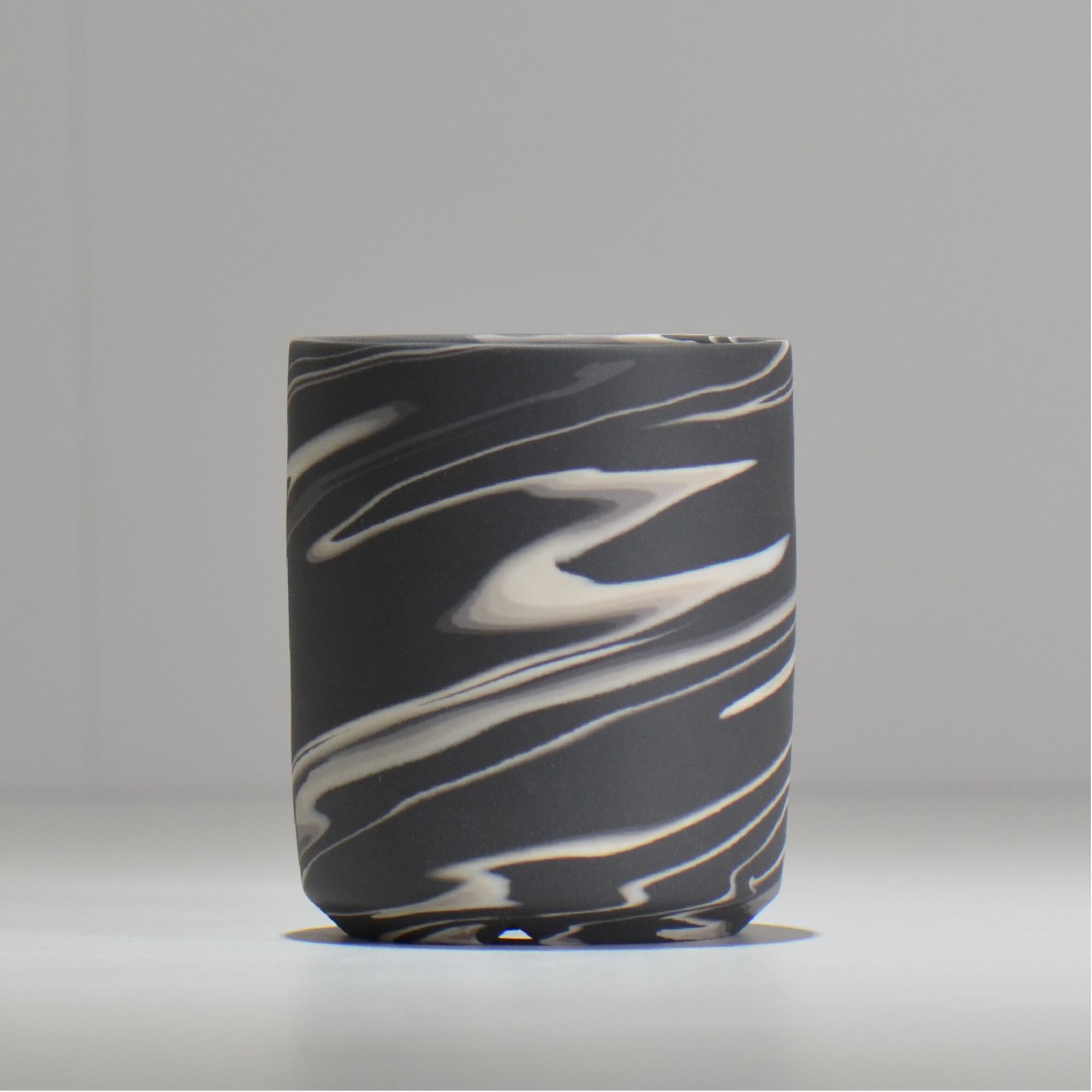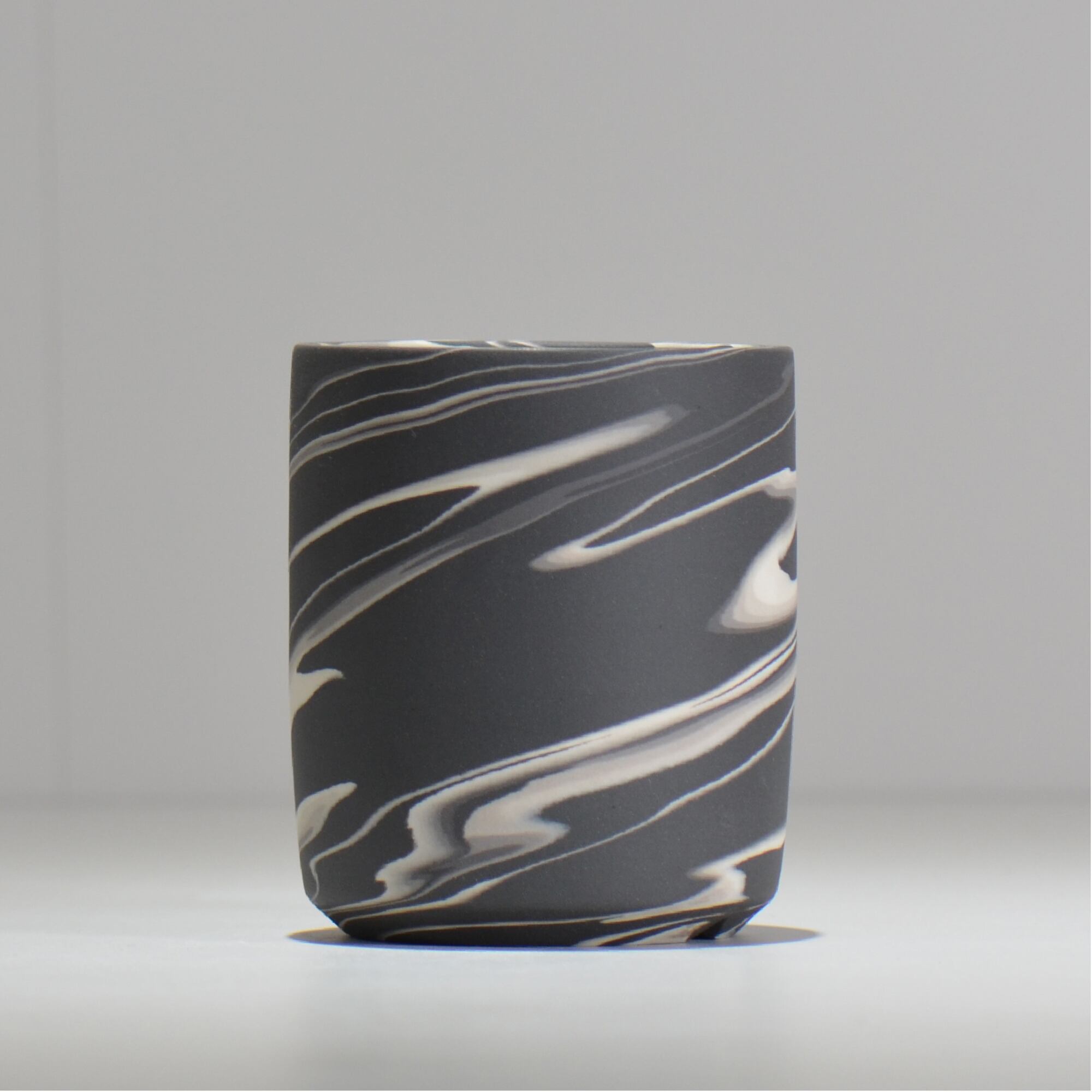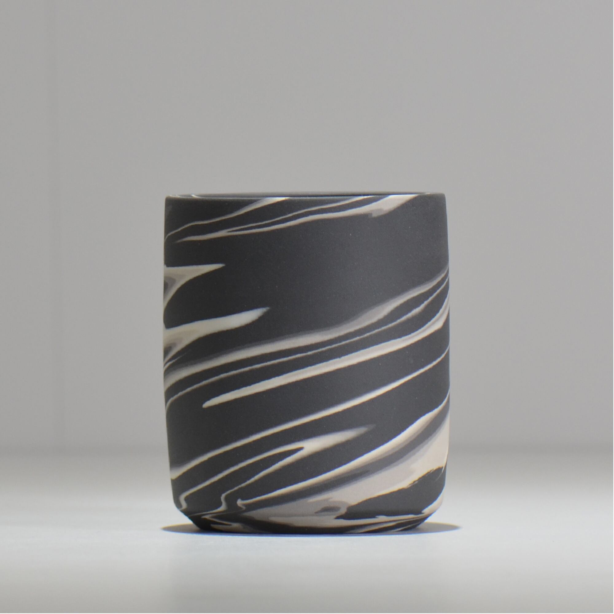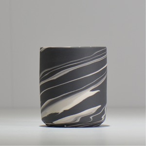 色の異なる磁土を一緒に練り合わせて成形し、全体を削ってゆくと様々な模様が表出してきます。