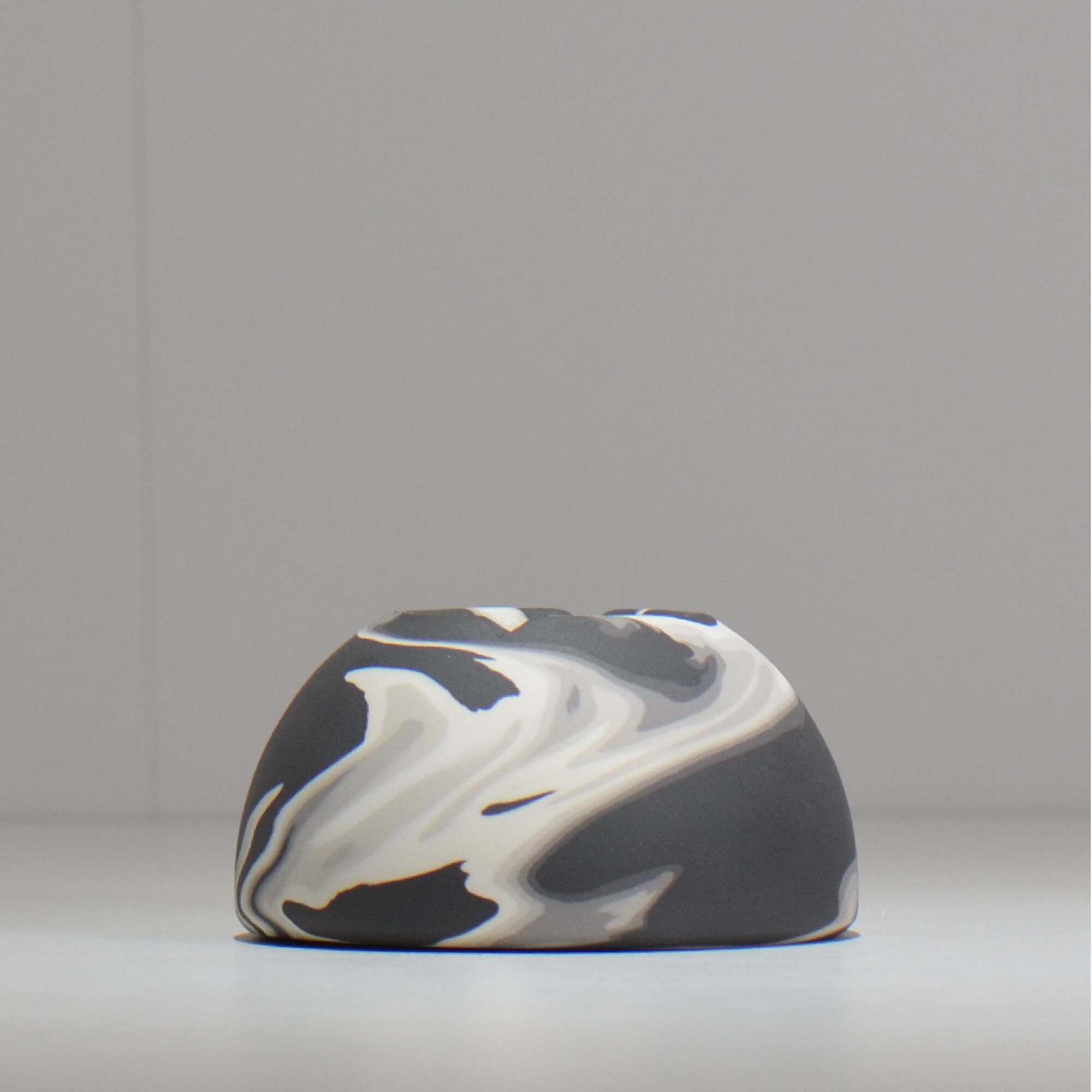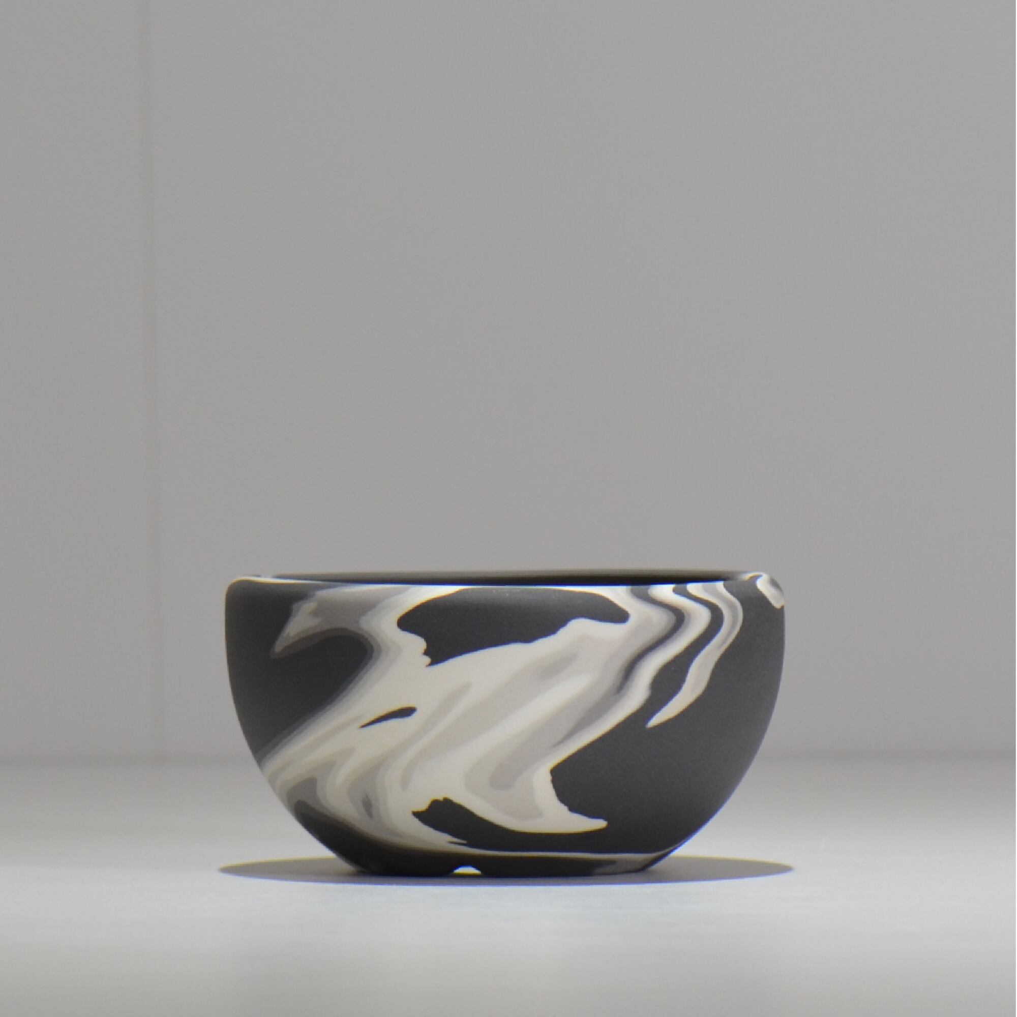 色の異なる磁土を一緒に練り合わせて成形し、全体を削ってゆくと様々な模様が表出してきます。